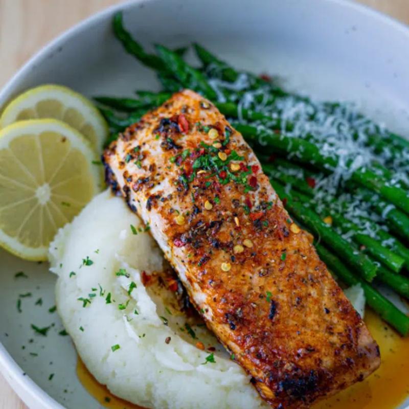 A juicy, hand-cut ribeye seasoned simply with sea salt and cracked black pepper, seared to your preferred doneness. Served with a generous portion of fluffy, butter-whipped mashed potatoes and a side of fresh, tender-crisp roasted asparagus.